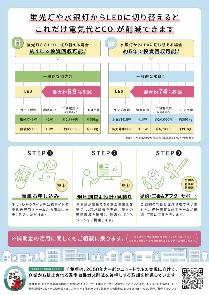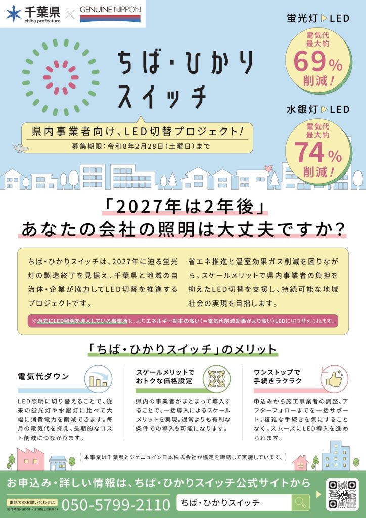 ちば・ひかりスイッチは、2027年に迫る蛍光灯の製造終了を見据え、千葉県と地域の自治体・企業が協力してLED切替を推進するプロジェクトです。省エネ推進と温室効果ガス削減を図りながら、スケールメリットで県内事業者の負担を抑えたLED切替を支援し、持続可能な地域社会の実現を目指します。