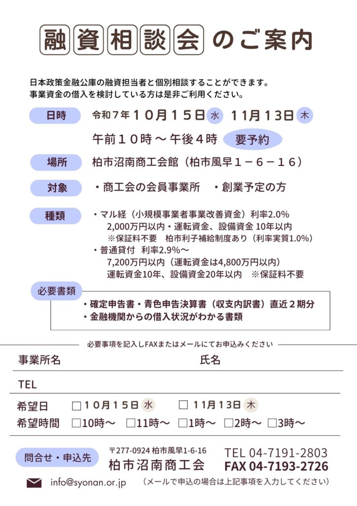 参加を希望する方は柏市沼南商工会へご連絡ください。